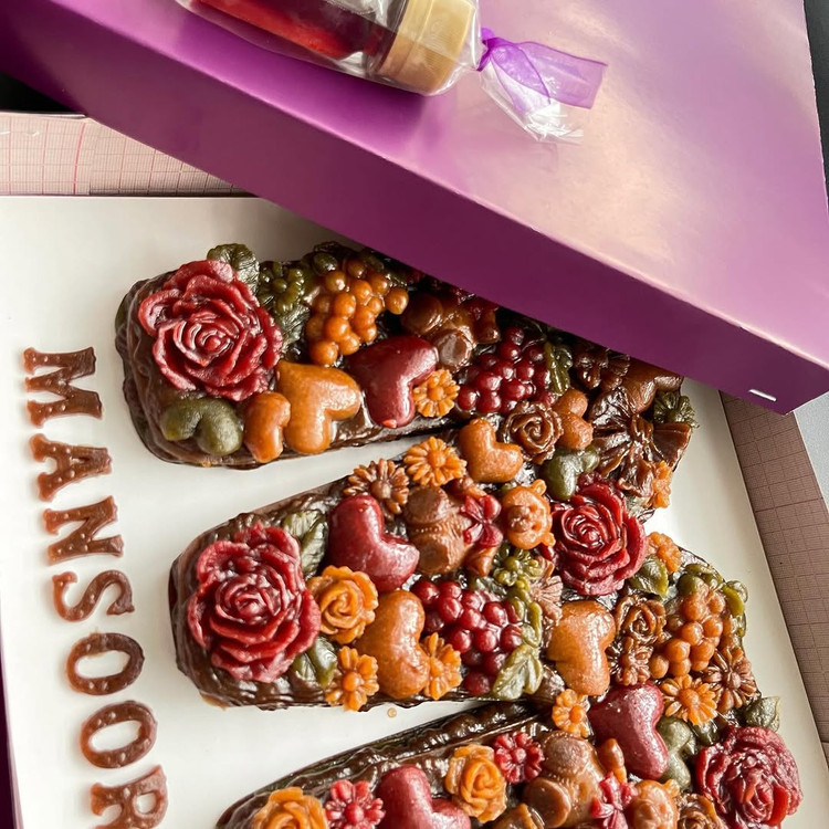 خاص تر از این نداریم*سابله حروف انگلیسی لواشک چندلایه با فیلینگ کرم ترش لواشک- و دیزاین گل های رزت (طبق سلیقه مشتری) جعبه کادویی و سس لواشک